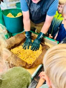 Die Kinder halfen beim Waschen und Einfüllen der Äpfel und beobachteten im Anschluss gespannt, wie aus den saftigen Früchten langsam der Most in den Kanister lief. Viele staunten darüber, wie viel Kraft dafür nötig ist. Am Ende durften alle den frisch gepressten Apfelmost probieren – ein köstlicher, süßer Lohn für die fleißige Arbeit.