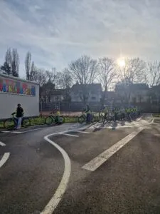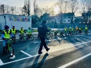 Anschließend durften die Kinder ihr Können praktisch unter Beweis stellen. Mit Fahrrädern fuhren sie auf dem Übungsparcours der Jugendverkehrsschule, der echte Verkehrssituationen nachbildete. Dabei achteten die Kinder besonders auf Handzeichen, das Anhalten an Stoppschildern und das Umschauen vor dem Abbiegen. Die Polizisten gaben hilfreiche Tipps und unterstützten die Kinder, wenn Unsicherheiten auftraten.