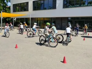Anschließend ging es auf den Fahrrädern weiter. Die Kinder übten unter Anleitung das sichere Anfahren, Bremsen, Kurvenfahren und das richtige Verhalten an Kreuzungen. Besonders geachtet wurde auf das Umschauen und Handzeichen geben – wichtige Fähigkeiten für eine sichere Teilnahme am Straßenverkehr.