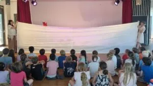 Anschließend zeigte die Klasse 3a das englische Stabpuppentheaterstück „Scat the Cat“. Die Kinder sprachen ihre Texte auf Englisch und bewegten die Figuren hinter einer Kulisse. Die Geschichte handelte von der schwarzen Katze Scat, die sich immer wieder in andere Farben verwandelte, bis sie schließlich merkte, dass sie als schwarze Katze am glücklichsten war.